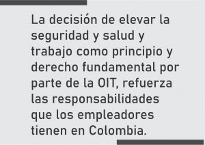 Por otra parte, en el panorama nacional, la decisión de elevar la seguridad y salud y trabajo como principio y derecho fundamental por parte de la OIT, refuerza las responsabilidades que los empleadores tienen en Colombia en la materia, esto de manera general son las obligaciones de protección y salud y seguridad para con los trabajadores, el brindar instrumentos adecuados para el desarrollo de las funciones, el procurar los locales apropiados y los elementos adecuados de protección contra los accidentes y enfermedades laborales; el desarrollar, ejecutar y actualizar el Sistema de Gestión de Seguridad y Salud en el Trabajo (SG-SST) para la identificación de peligros, evaluación y valoración de riesgos y establecimiento de medidas de control; entre otros. En este entendido, el cumplimiento de las obligaciones referenciadas y las demás establecidas por la normatividad en el marco de la seguridad y salud en el trabajo cuenta con un grado adicional de relevancia y nos permite seguir avanzando, promoviendo la mejora continua.